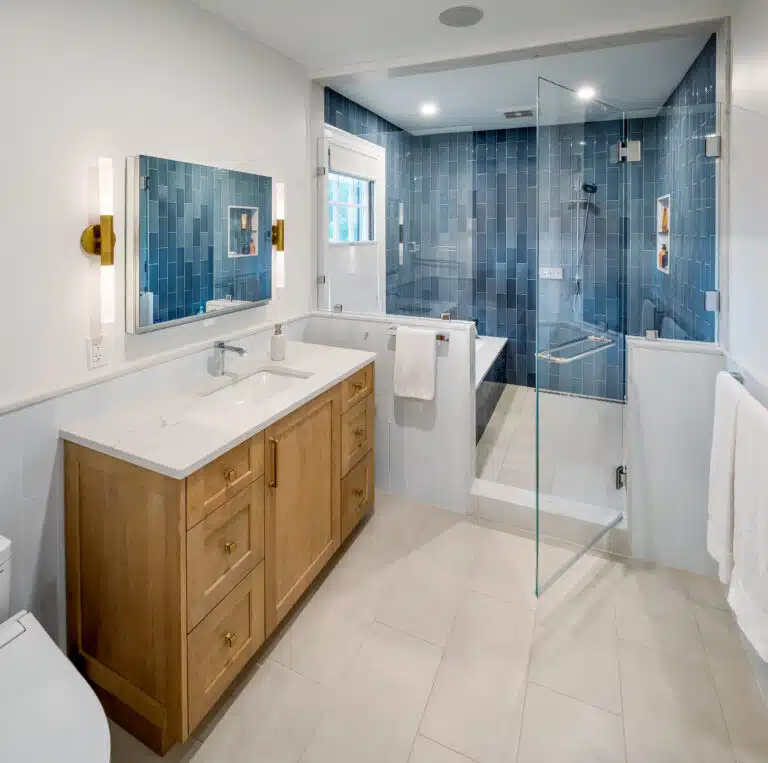 Now, the bedrooms layout feels spacious while still boasting ample storage in every corner. Between the closet and primary bathroom, a comfortable seating area and built in bookcase offer the couple a space to unwind or prep for their day. The closet has floor to ceiling storage and a skylight to ensure quality lighting everyday. The primary bath is like something straight out of a luxury spa. The calming blue tiles and natural wood tones pair perfectly for a contemporary feel. To top it off, a European wet-room makes any morning routine exciting.