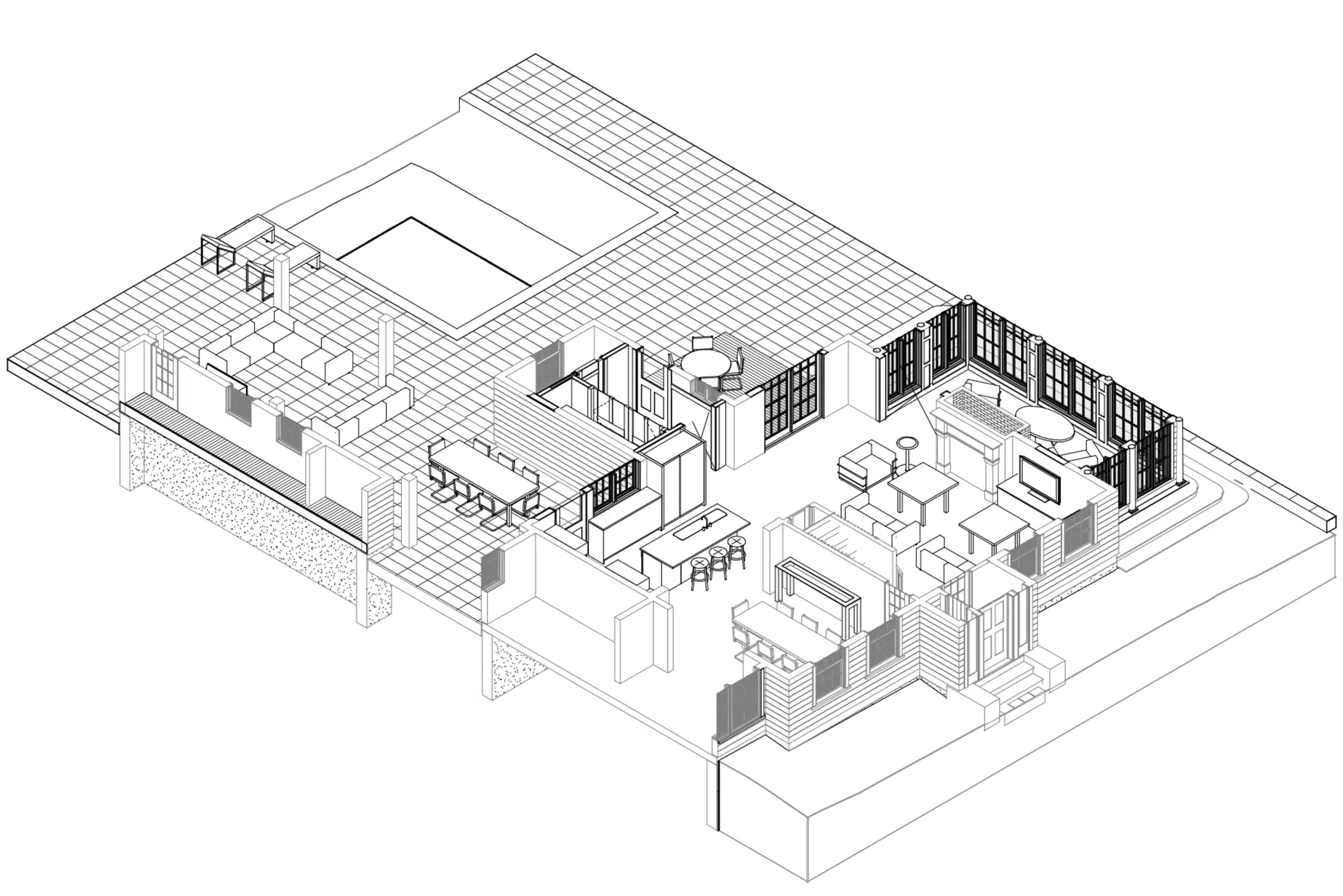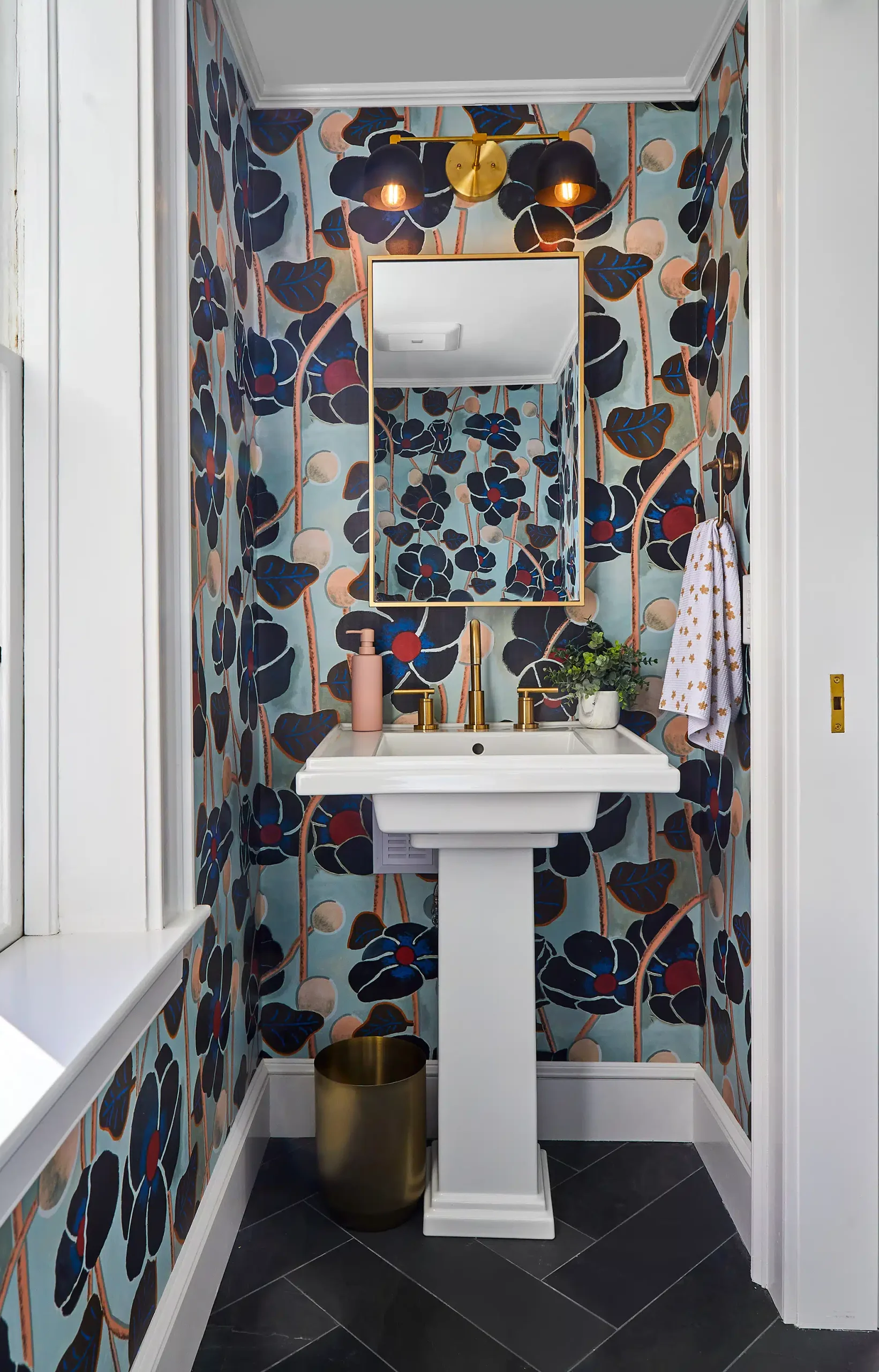 This home remodel involved removing multiple walls to open the first floor up, increasing flow and allowing more natural light into the space. The kitchen was redesigned to accommodate the busy family’s lifestyle and included a large sit-in island with a five-foot Galley Workstation. Open to the kitchen is the spacious living room with modern furnishings and a custom entertainment center. Peeling off from the kitchen and living room is the new laundry station and powder room, complete with modern appliances and playful designer wallpaper, respectively. However, a bold and dramatic four-season room is the unlikely star in this renovation. With its near-black walls and panoramic views, this former sunroom is now suitable for year-round use and the perfect relaxing spot after a long day.