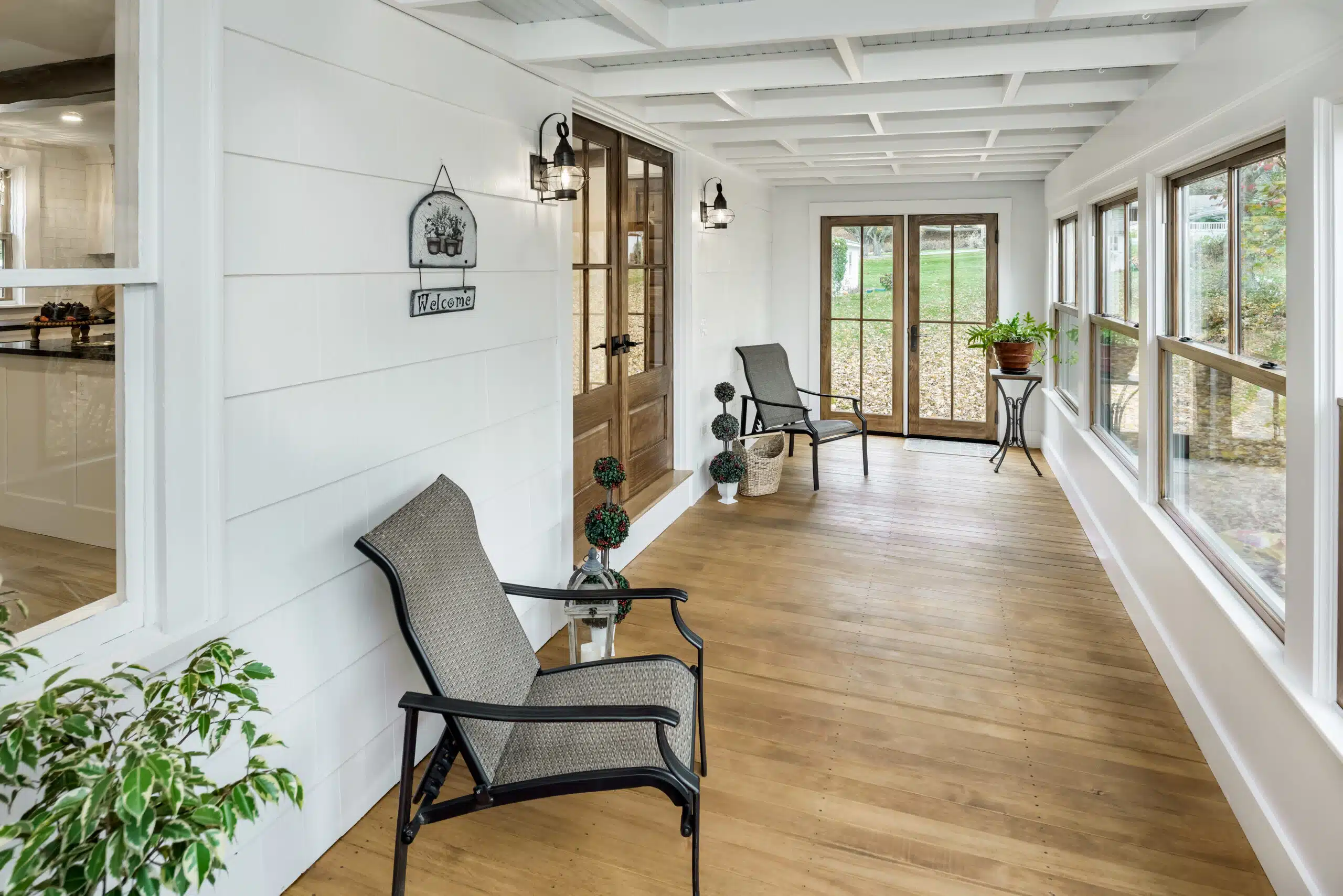 By strategically removing a disused chimney and the wall separating the dining room from the kitchen and relocating the kitchen powder room, our team was able to completely reenvision our client’s kitchen layout in a way that allowed for better flow, more space, and increased natural light. Now much more open and inviting, the updated kitchen features modern appliances, custom cabinetry, and a large sit-in island. Newly installed french doors and windows allow for beautiful views into the freshly renovated sunroom and beyond.