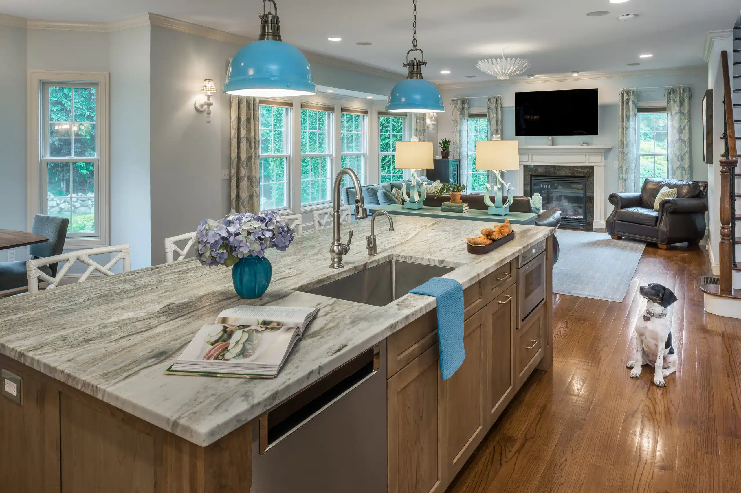 In East Greenwich, a growing family yearned for a kitchen with an updated traditional style, more space to gather together, and maximized functionality. This kitchen remodel transformed the space by implementing new color schemes, new and top of the line appliances, high end countertops, and cabinets to balance traditional with modern. This kitchen has the perfect amount of contrast featuring a gorgeous white oak island to contrast with the white cabinets.