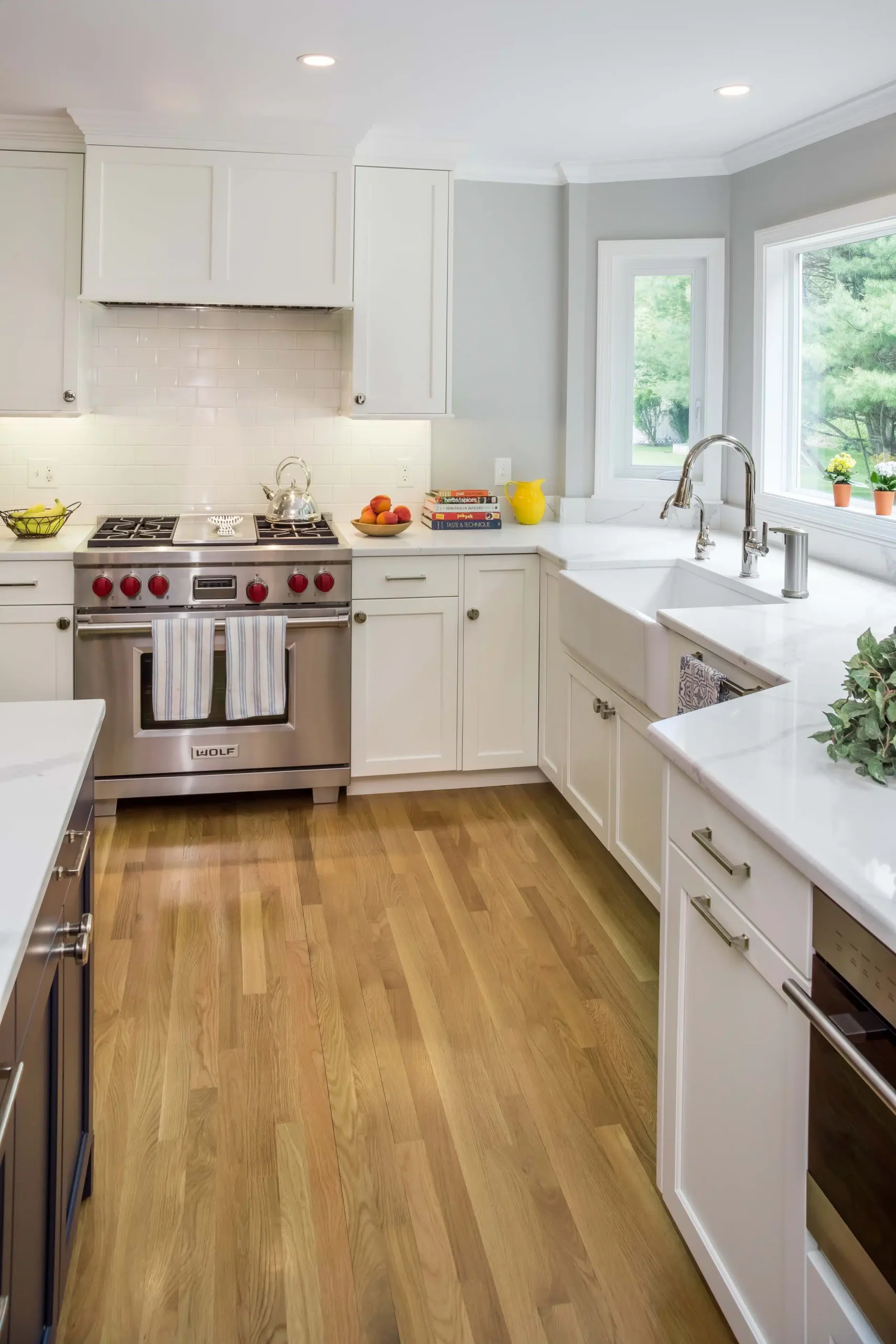 We removed the wall between the kitchen and dining room, allowing space for a larger island and a view into the new addition. The new layout moved the range into the previously under-utilized area by a sliding door. The slider was transformed into a bay window above a new farmer’s sink. A gorgeous Navy island now takes center stage for casual dining and storage.