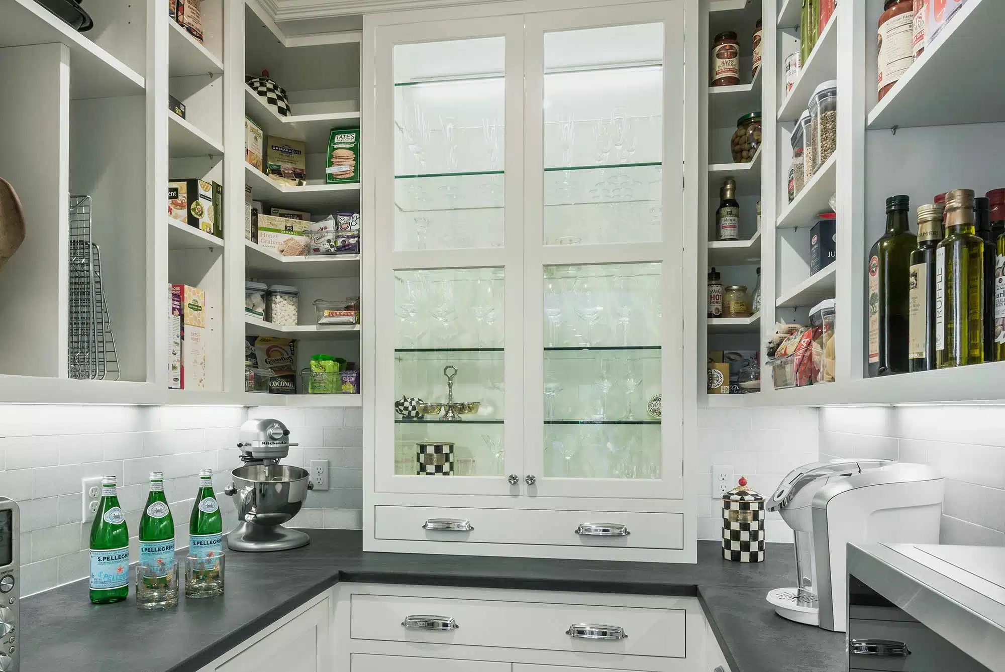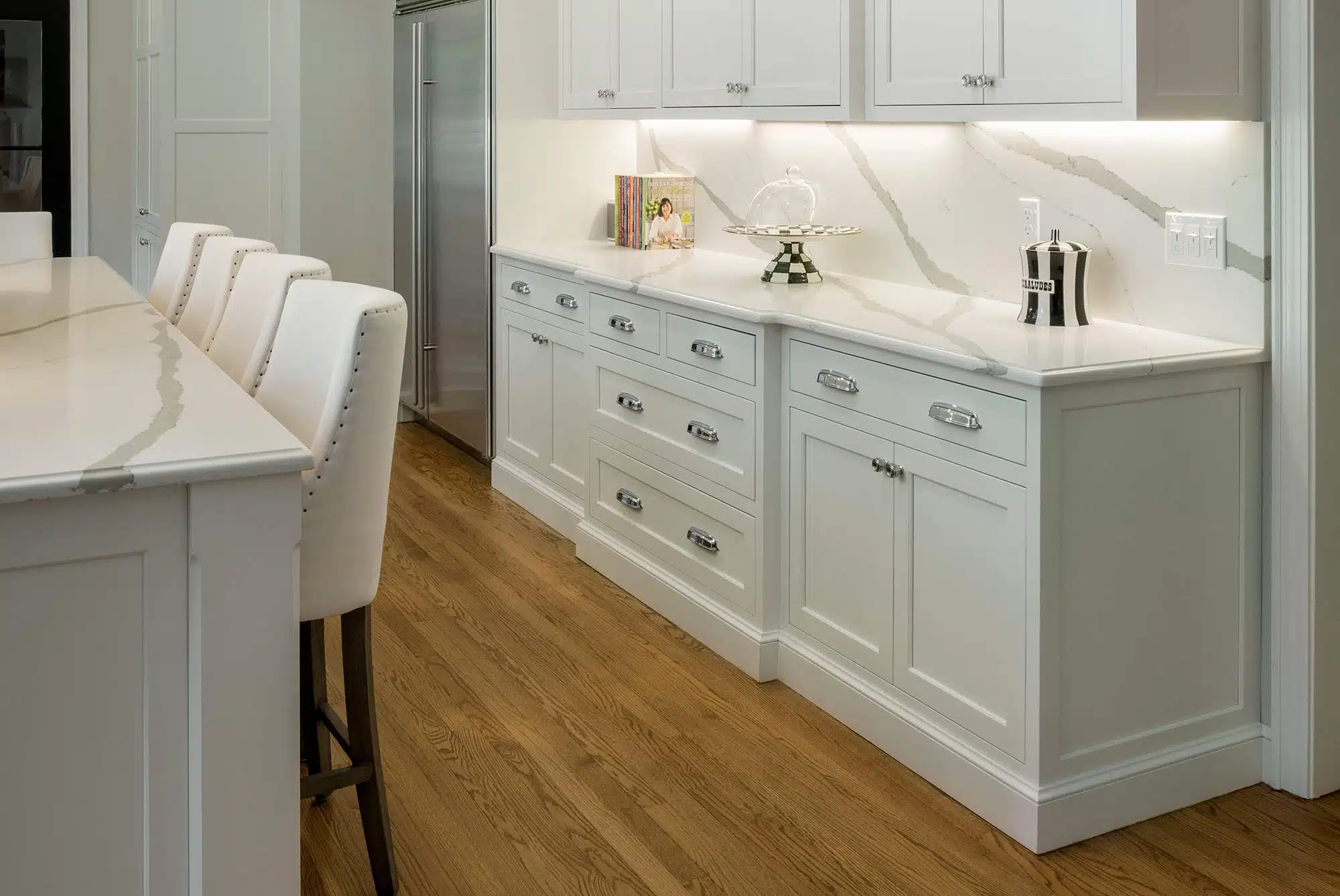 We redesigned a new, modern fireplace to be flush against the wall with a white stone surround and an updated mantel. Finally, our team removed one of the two built-in bookcases, lightening the overall feel of the room. Although we reduced the overall footprint of the space by adding a walk-in pantry and a large island, the result was a design that felt more spacious and comfortable.