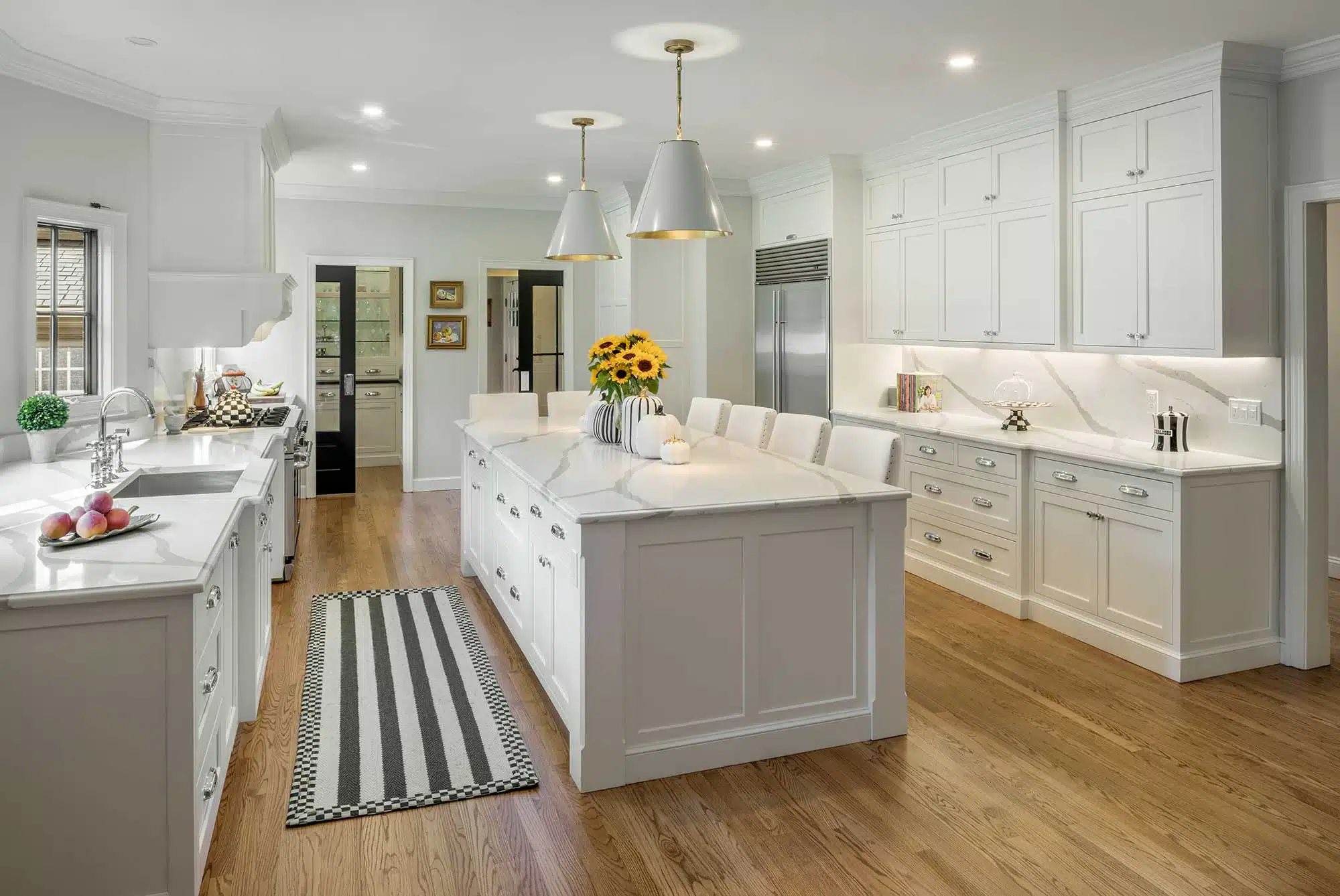 The homeowners had a shared vision: a white, bright, and open kitchen with a massive island as a gathering space. A walk-in pantry to fit all staples and gourmet cookware. They imagined everything adorned with high-end finishes. The design team completely reorganized the layout of the kitchen.