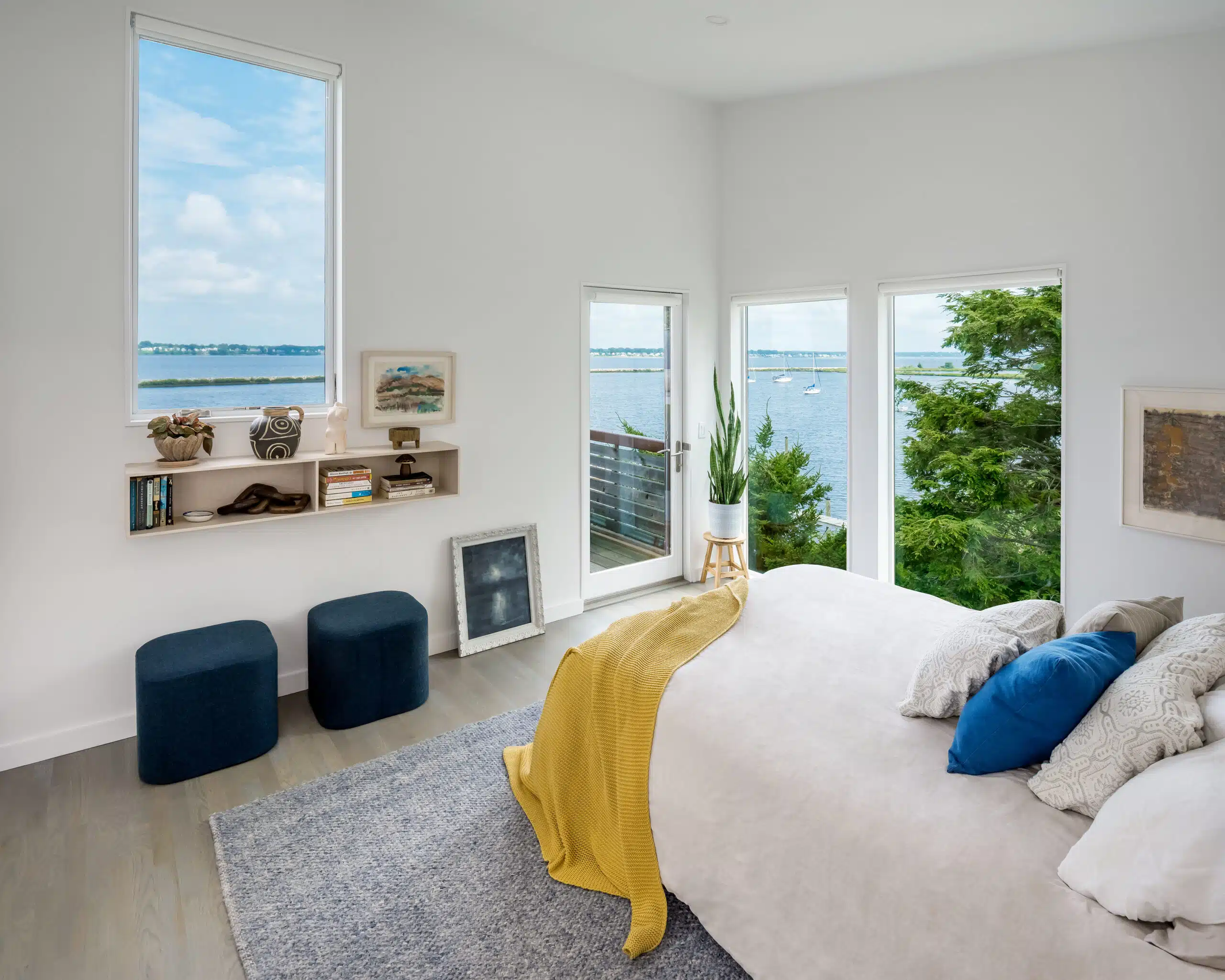 Originally one large open room, the primary bedroom’s size necessitated a division of space to refine its functionality and flow. Strategically placed walls transformed the bedroom into a suite. Partition walls allowed the introduction of a walk-in closet with thoughtful storage elements, an expansive and contemporary custom vanity, an elegant curbless shower, and a bespoke headboard, oriented so our clients wake up every morning overlooking the water.