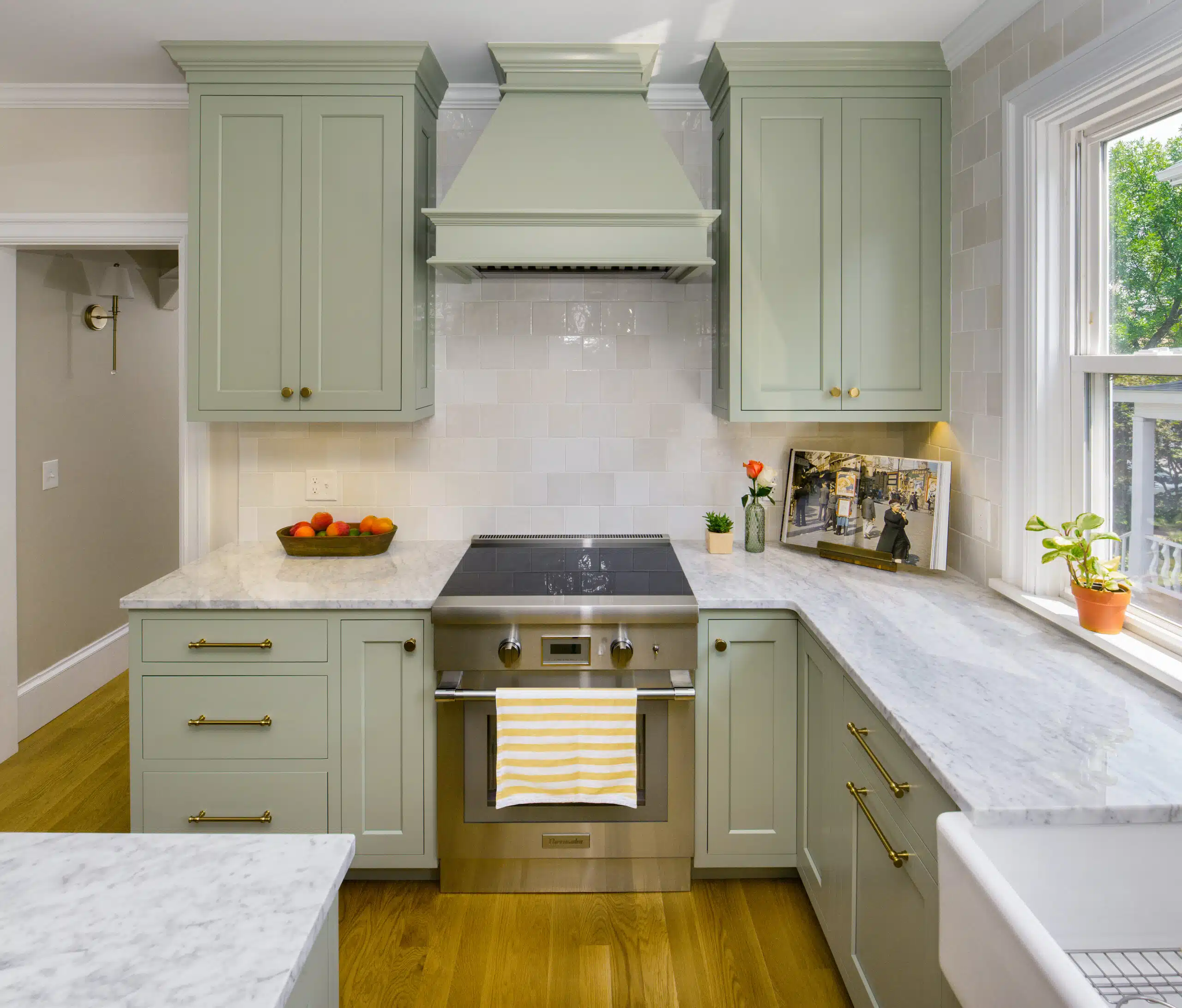 Red House approached the challenge and presented an exciting solution to their pain points. We would take down the dividing wall and open the pantry to allow for open access into the kitchen from the hallway. Though they may have lost a pantry, we were sure to replace it with ample storage in the kitchen so that it is not even missed! The kitchen is stunning, with a sage green color selection on their shaker cabinets, and the gold fixtures bring the whole design together. The natural marble countertops carry that luxurious feel to the space, and the farmhouse sink reminds you that a family centers themselves here after a long day of cooking and gathering together. This kitchen is filled with natural light, elegance, and function.