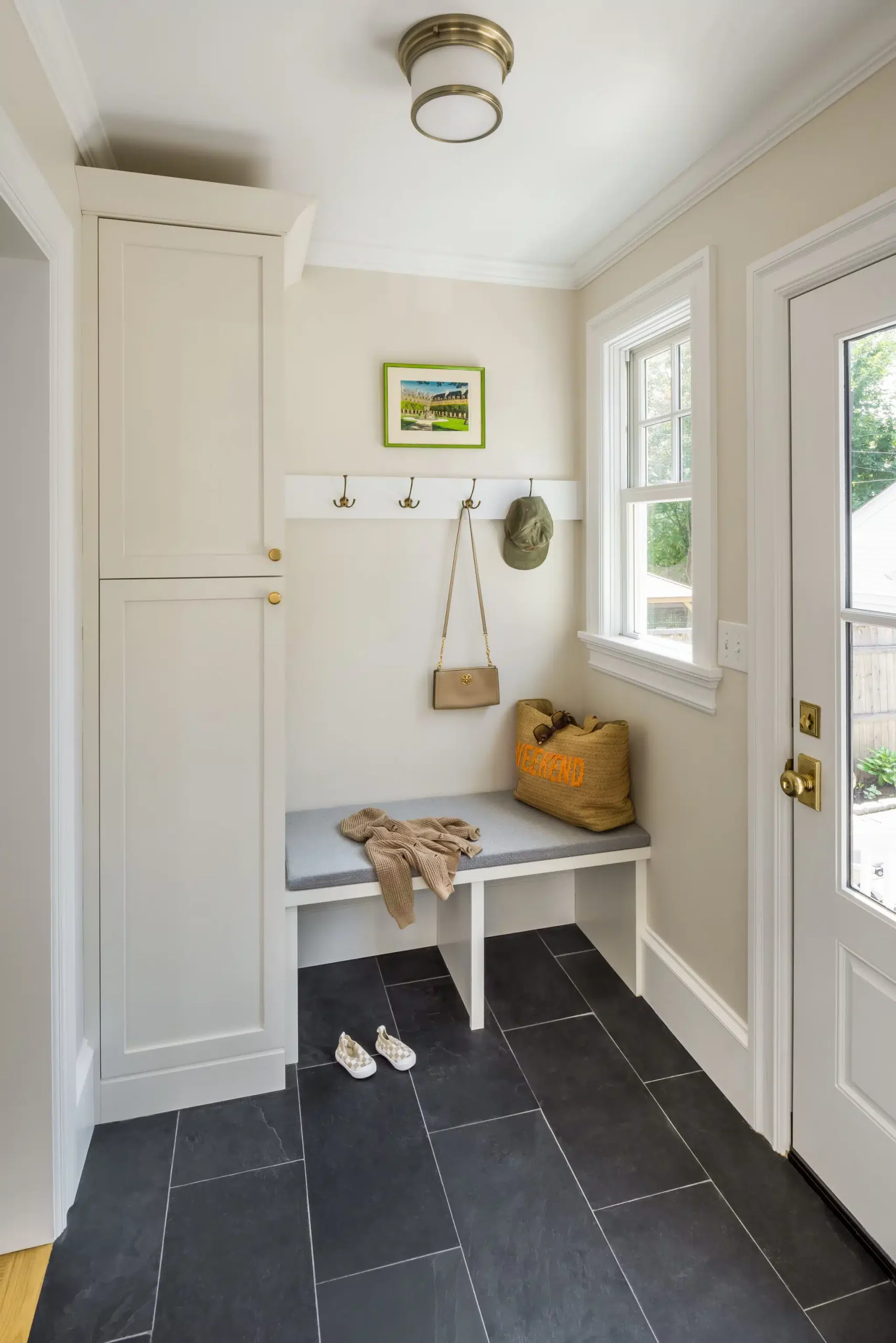 Adjacent to this beautiful kitchen is a completely reimagined mudroom and powder room bridging the transition from outside in. The slate tile pairs perfectly with the white built-in bench seating and floor to ceiling dresser. Before, this space was small and cluttered. Now it is their main point of entry and functions as the perfect place to prepare for a day out. Across from the mudroom, a beautifully styled powder room welcomes you. The copper floral wallpaper is a gorgeous and bold selection that truly marks the value of design collaboration. Added some copper and gold fixtures, this space takes on the perfect balance of traditional and modern.