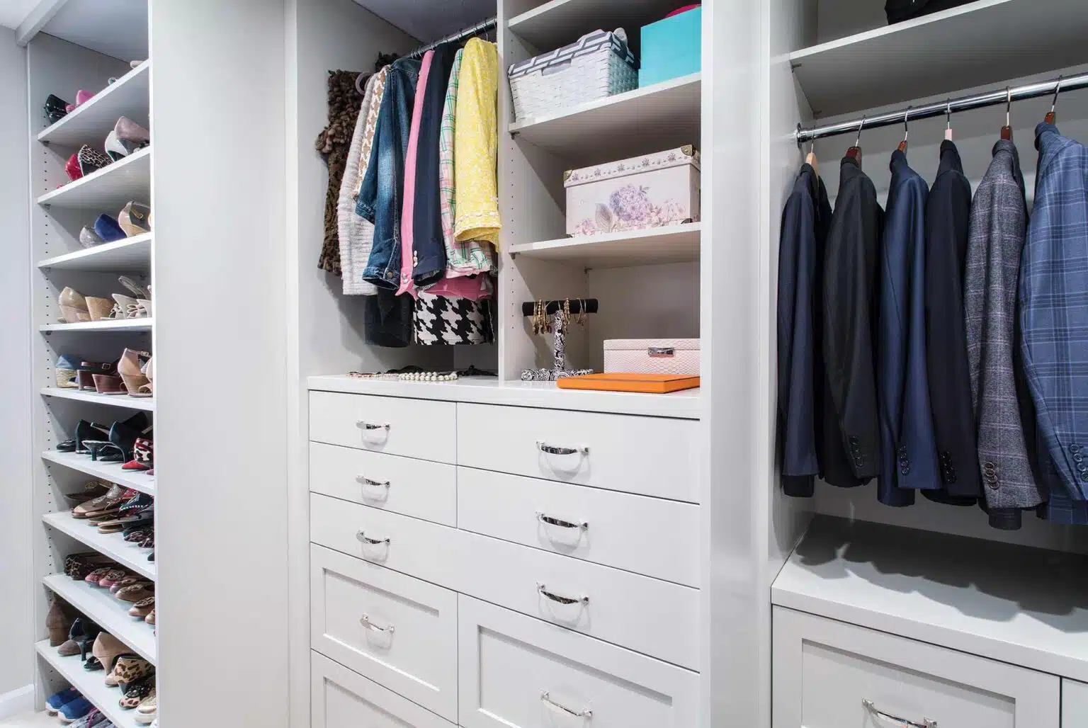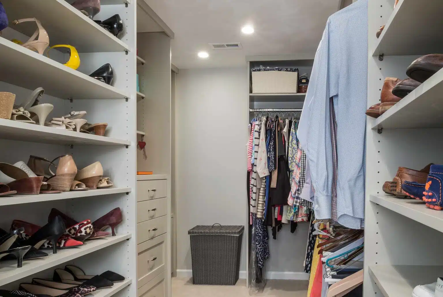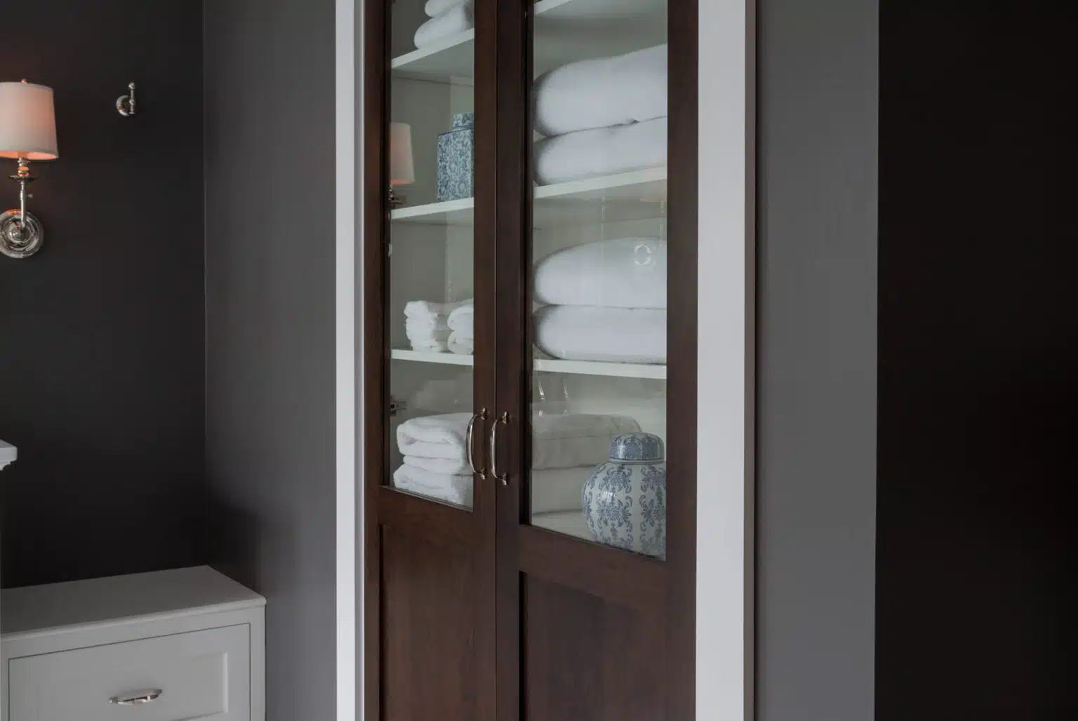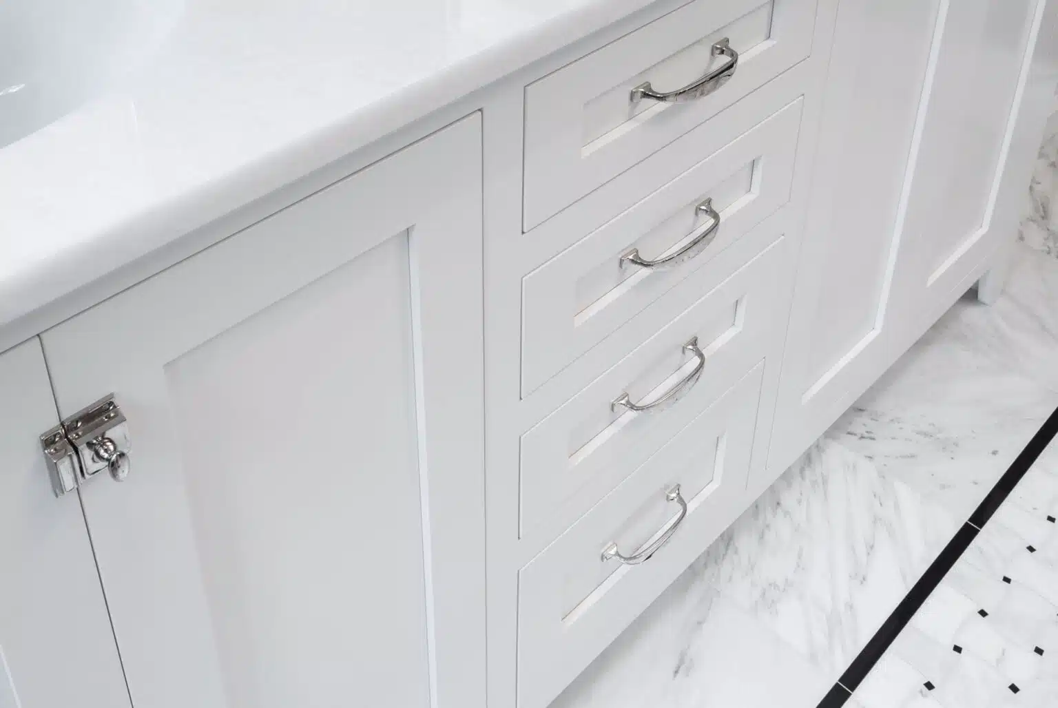 We designed and installed custom inset cabinets, marble flooring with a basketweave pattern, and a stunning curbless shower with seamless white Corian marble walls. Using our design-build process, the clients were able to navigate the selection process, choosing stone, faucets, mirrors, and more. We also designed and built a custom walk-in closet with hanging space, closet drawers, and adjustable shelves, and a linen closet with custom cherry doors to fit their needs.