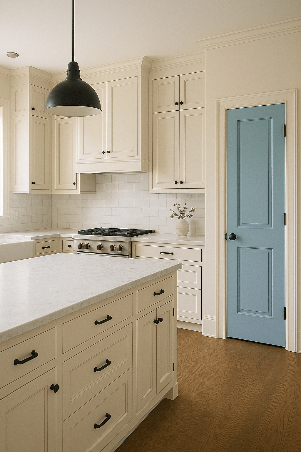 If selecting blue cabinetry doors feels too big of a commitment, what about your pantry or entrance doors? Adding a pop of color with your doors is an excellent option to bring in some of that color you are looking for and can help tie in the rest of the home!
